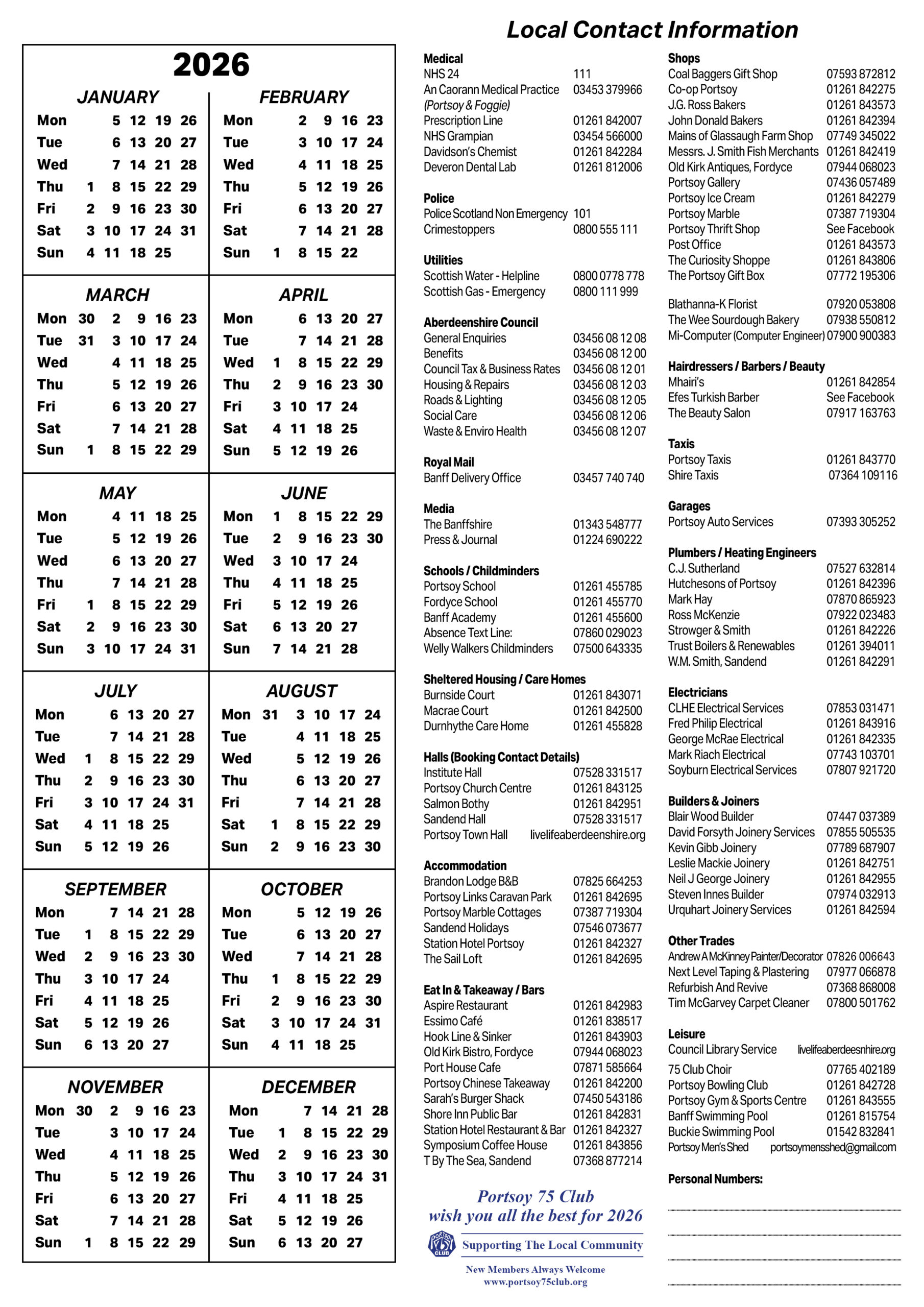 Portsoy 75 Club 2026 Calendar and Local Business Contact List