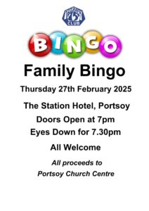Family Bingo February Date Feb 27 2025 Expired! Time 7:00 pm - 7:30 pm Location The Station Hotel, Portsoy Share this event