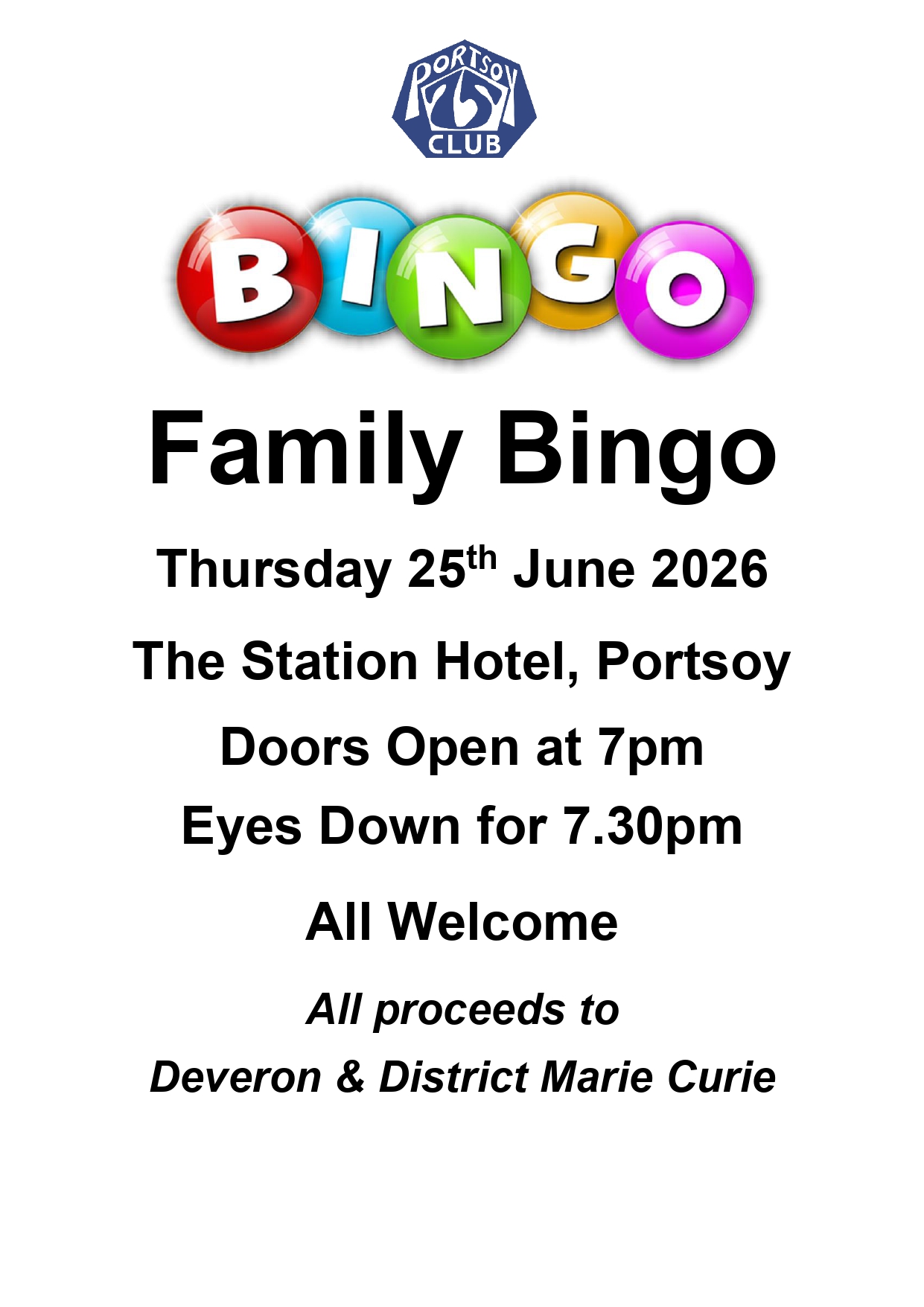 FAMILY BINGO – JUNE FAMILY BINGO Thursday 25th June 2026 Venue TBC Doors Open at 7:00pm Eyes Down for 7:30pm All welcome All proceeds to Deveron & District Marie Curie Date Jun 25 2026 Time 7:30 am - 6:00 pm Category Bingo Share this event
