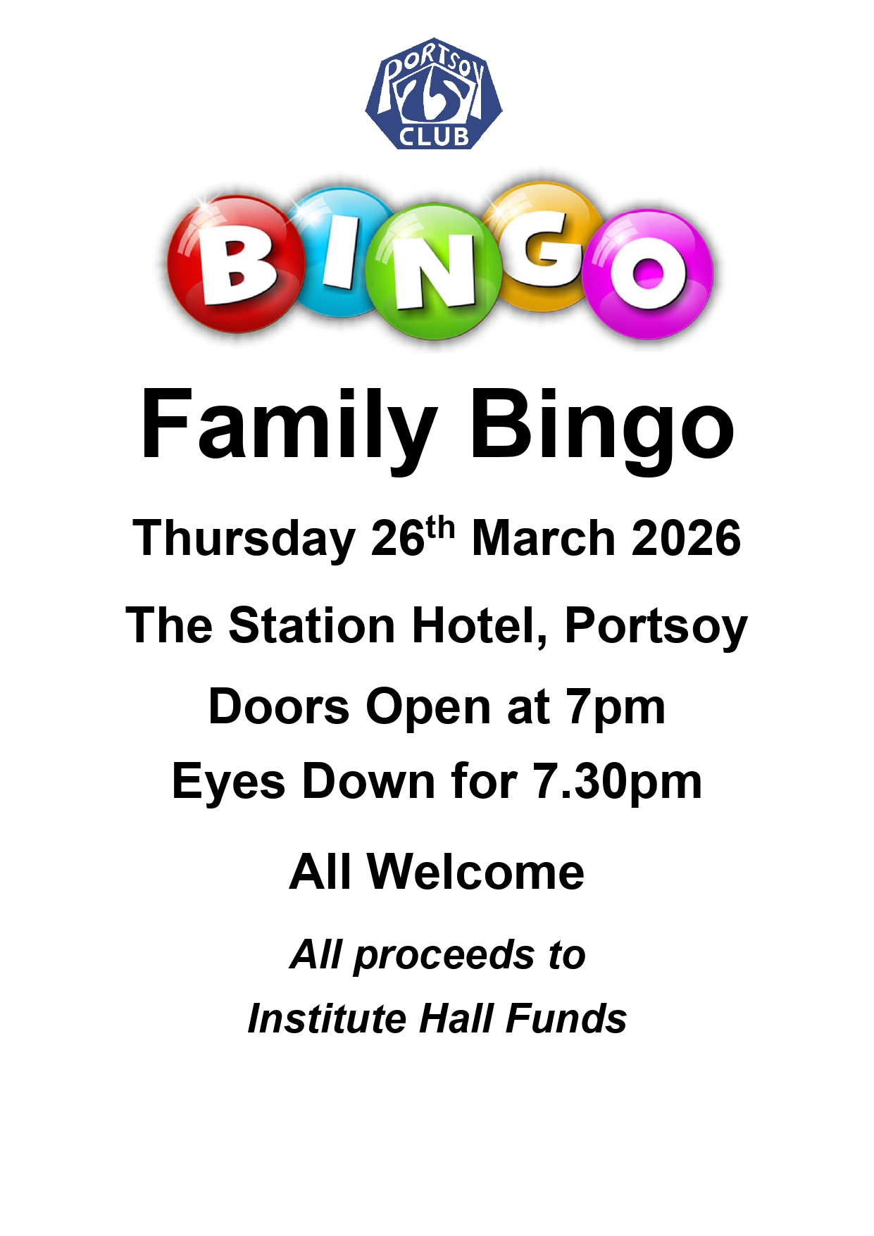 FAMILY BINGO – MARCH FAMILY BINGO Thursday 26th March Venue TBC Doors Open at 7:00pm Eyes Down for 7:30pm All welcome All proceeds to Institue Hall Portsoy Date Mar 26 2026 Expired! Time 7:30 am - 9:00 pm Category Bingo Share this event