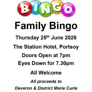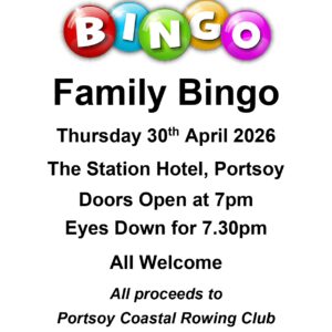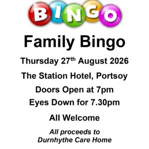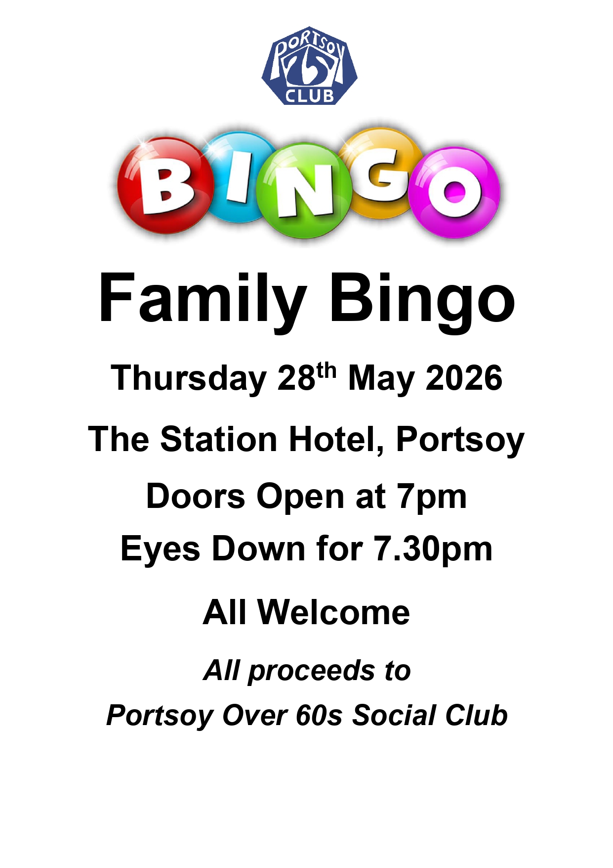 FAMILY BINGO – MAY FAMILY BINGO Thursday 28th May 2026 Venue TBC Doors Open at 7:00pm Eyes Down for 7:30pm All welcome All proceeds to Portsoy 60+ Social Club Date May 28 2026 Time 7:30 am - 9:00 pm Category Bingo Share this event