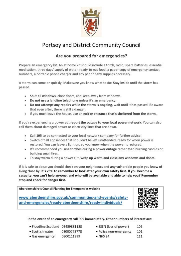 The information leaflets were compiled by Portsoy and District Community Council and offer advice and important contact numbers for lcoal residents in the event of disruptive seasonal weather which may cause power and phone outages.